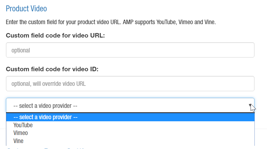 There are quite a few other customization options including sizes for the product image carousel, button labels, display price or not, and custom field for video ID or URL (and optional provider dropdown).