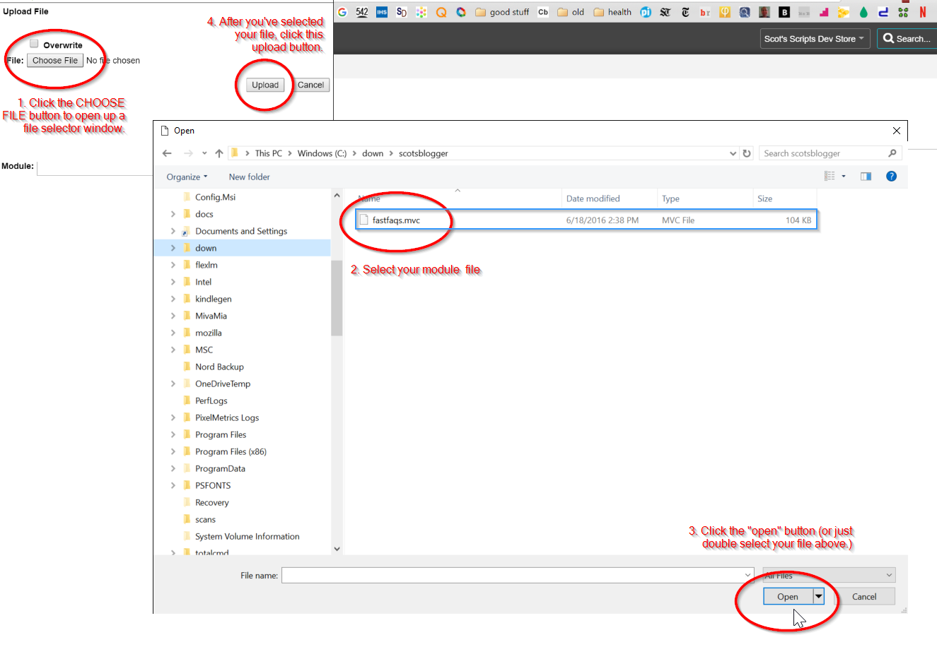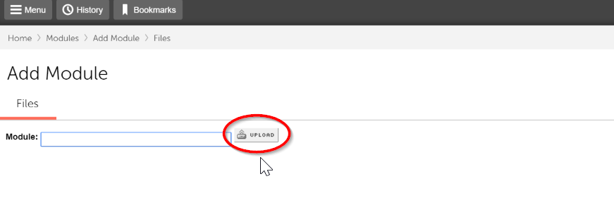 click the + button on the right hand side to add a new module click the UPLOAD button click the CHOOSE FILE button (see image below)