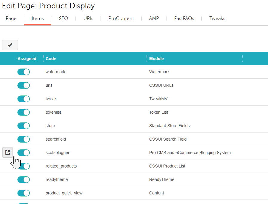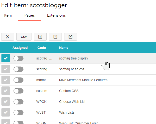 Assigning page items: this will only take a few minutes. Edit any page in your Miva Merchant admin and click on the ITEMS tab. Then find the scotsblogger item and hover over the left side where a little "open" graphic will appear. Click