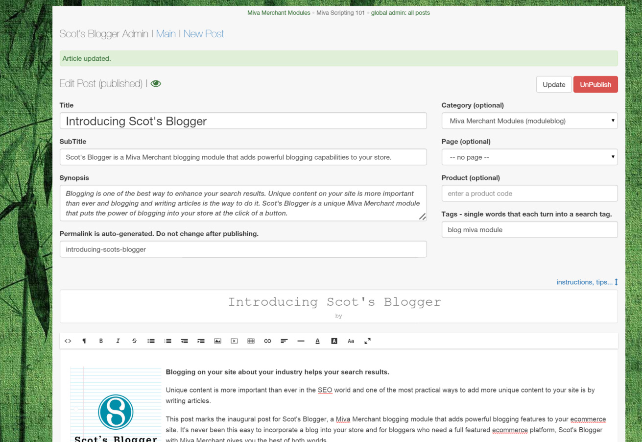 This is the inaugural post for Scot's Blogger, a Miva Merchant module that adds powerful blogging features to your ecommerce site. If you're a blogger who needs a store, Miva Merchant is an excellent ecommerce platform with unlimited customization potential.
