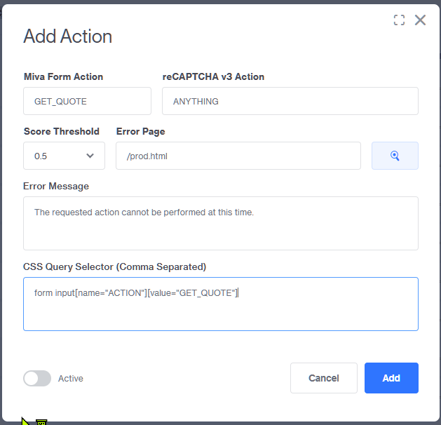 Requirements: Install the miva recaptcha v3 module and make sure it's all set up with the api code etc...