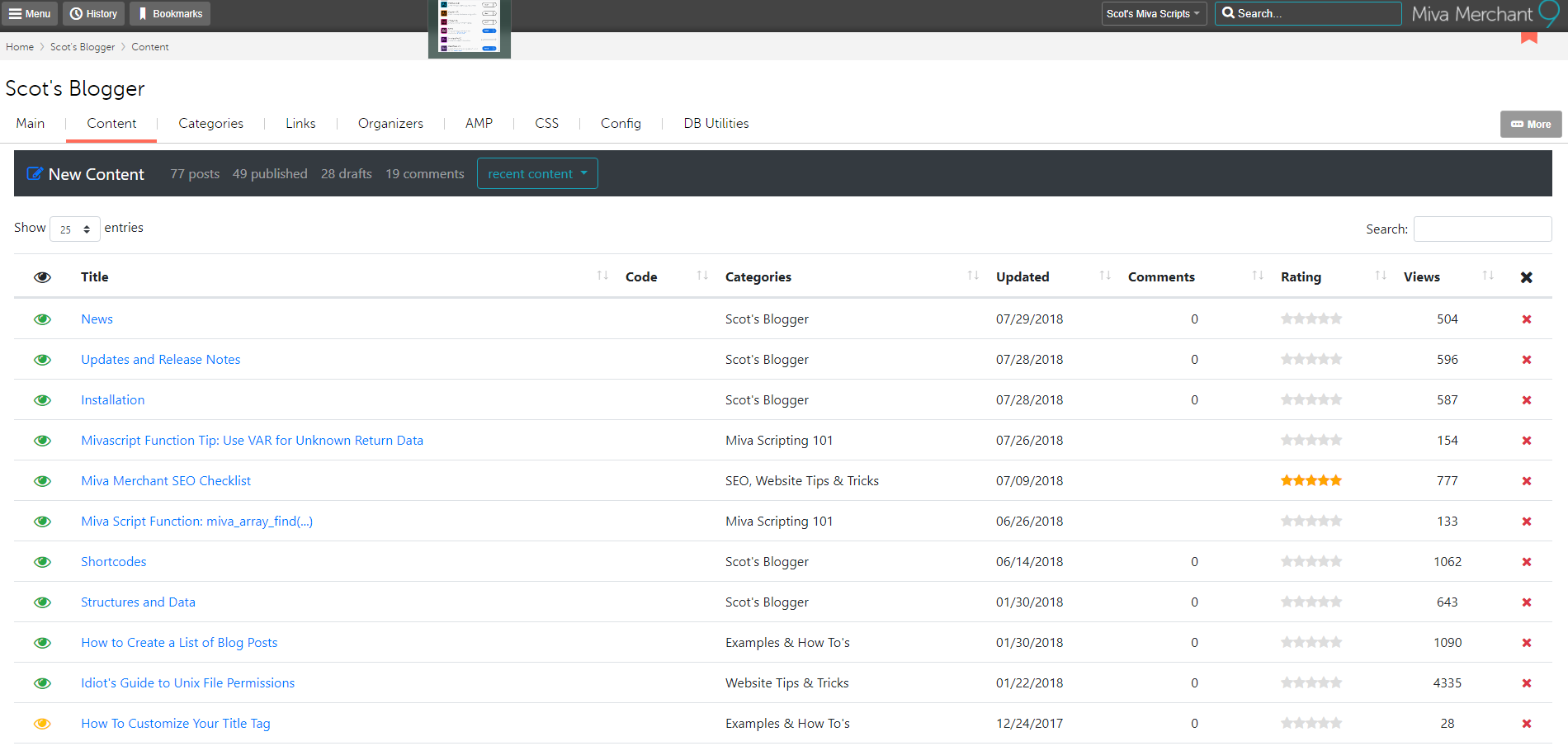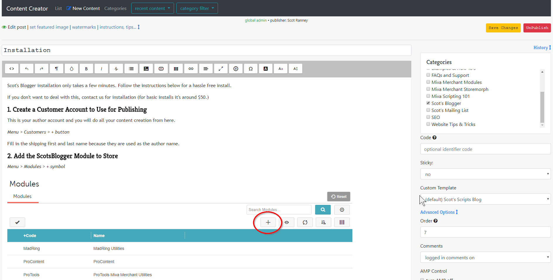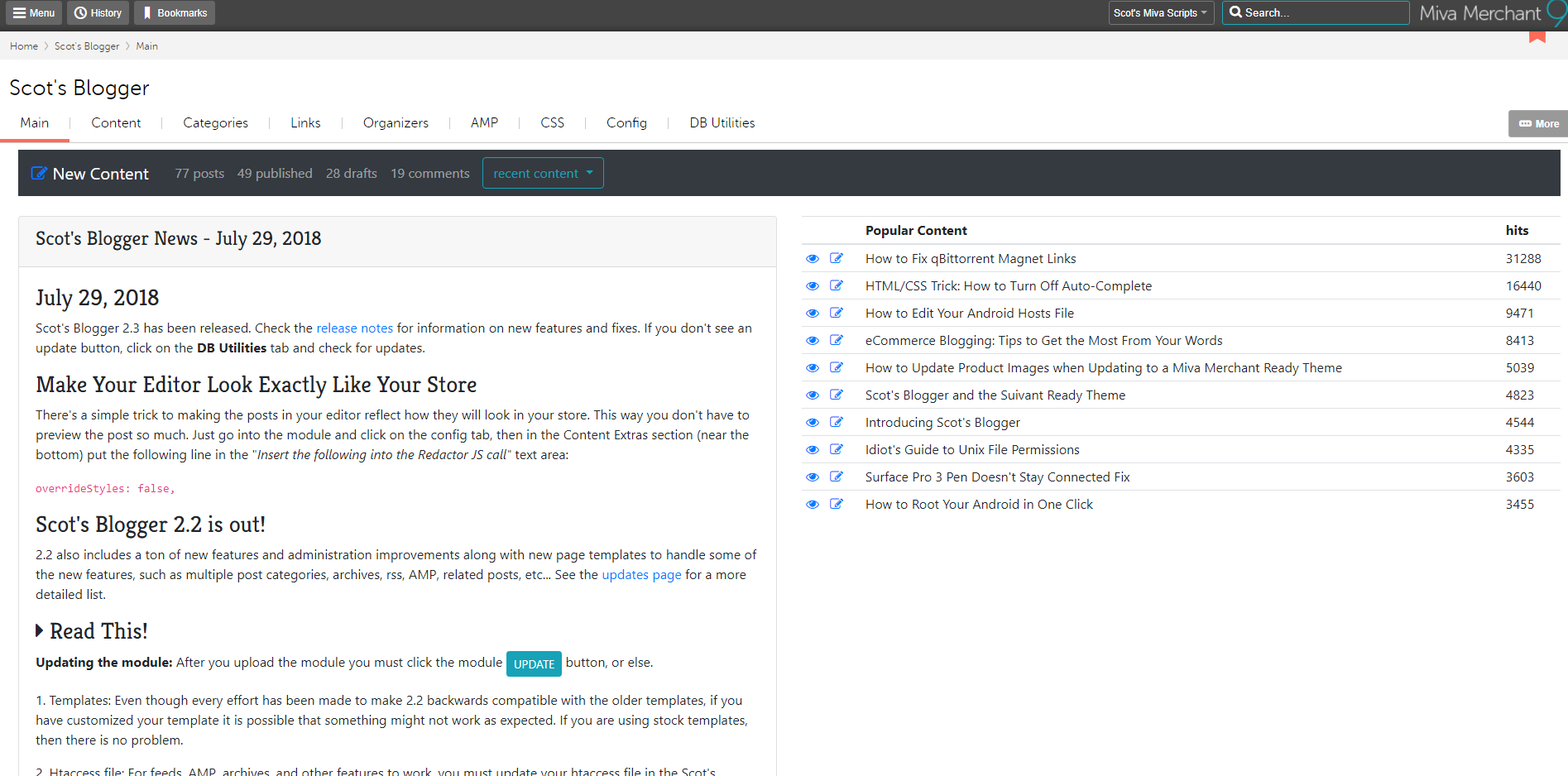 Scot's Blogger is a content management and blogging module for Miva Merchant featuring an advanced visual block editor, drag and drop images, tags, categories, and all the other features you expect in a blogging and content platform.