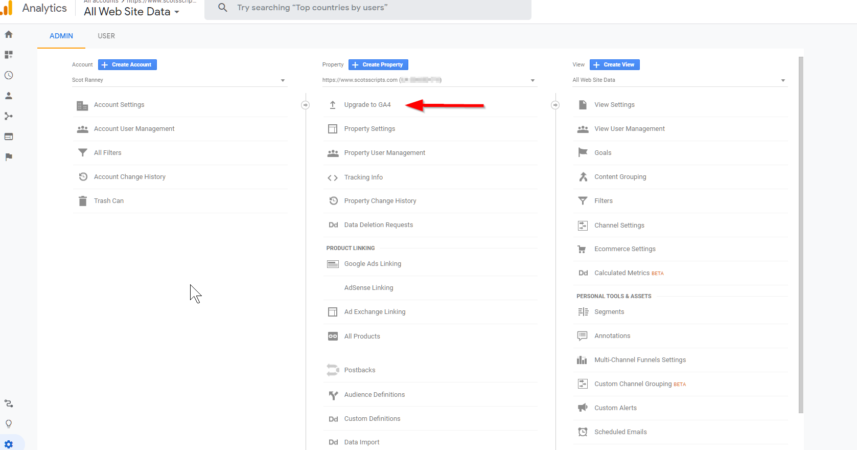 2. in the PROPERTY column (middle column) click on UPGRADE TO GA4 if it's available (top option)