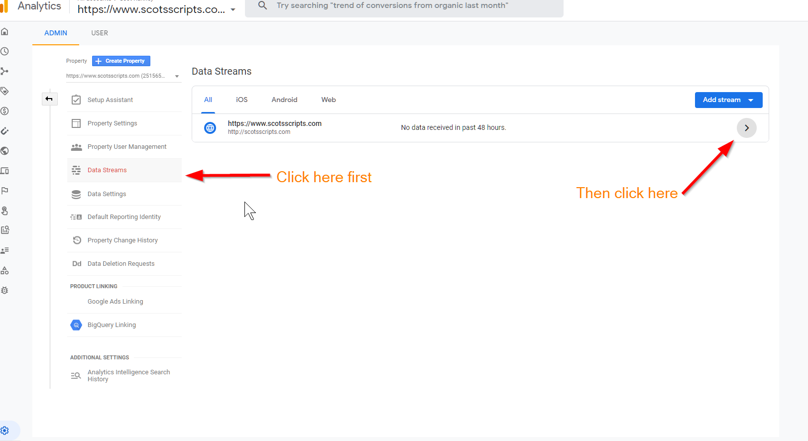 Also in that column is DATA STREAMS. Click on that then click on the gray circled arrow on the right of the data stream so we can get your GA4 credentials.