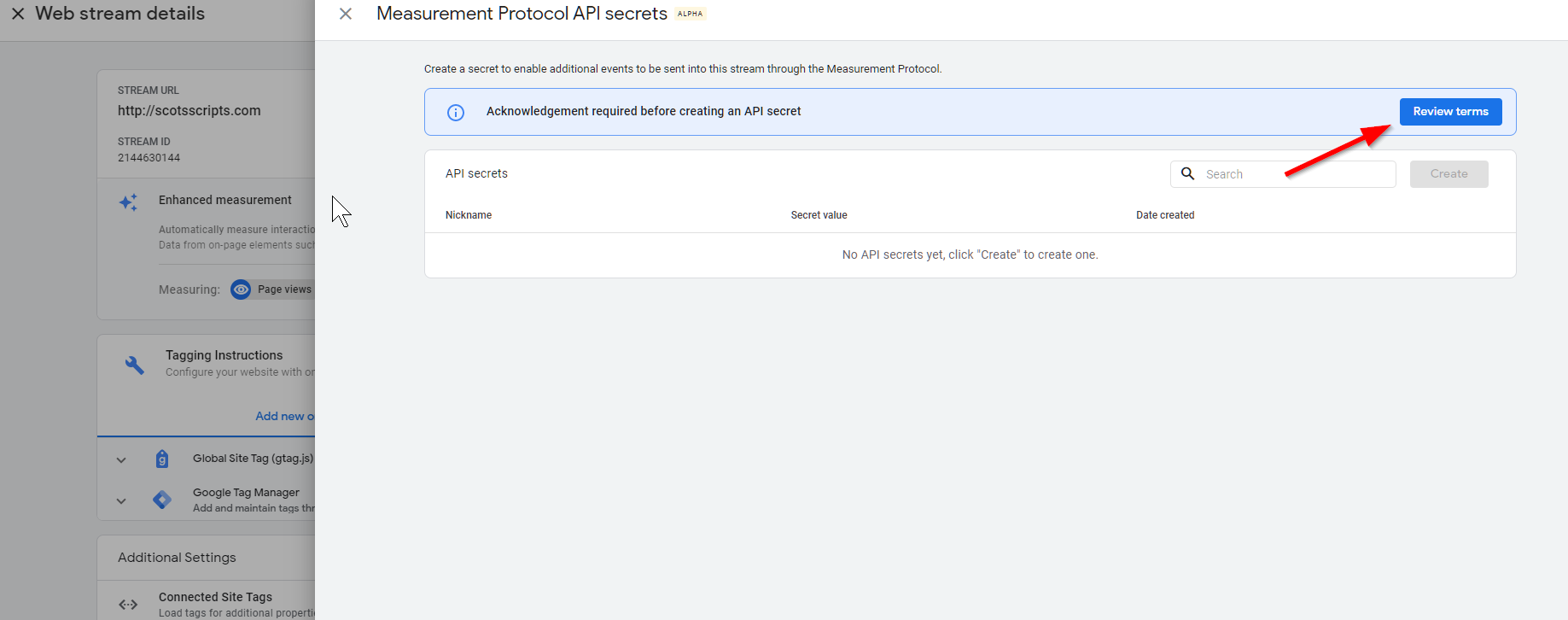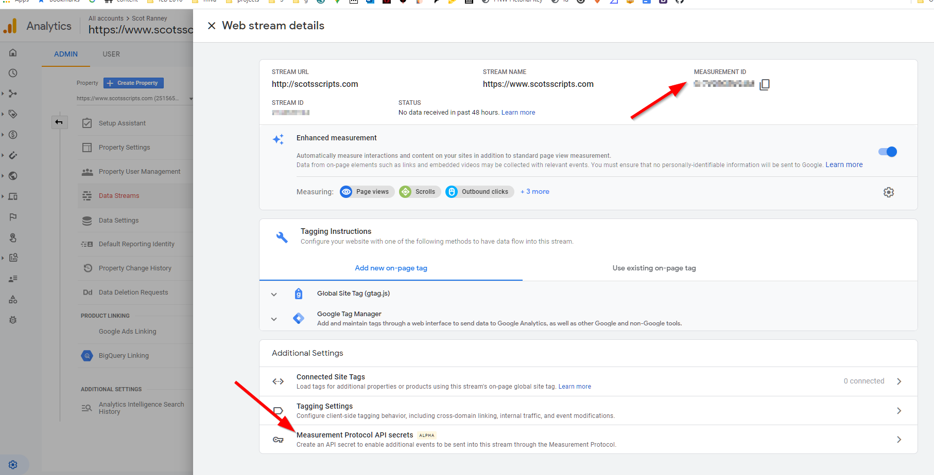 5. After the Web Stream Details window opens, copy down the Measurement ID and then click on the MEASUREMENT PROTOCOL API SECRETS.