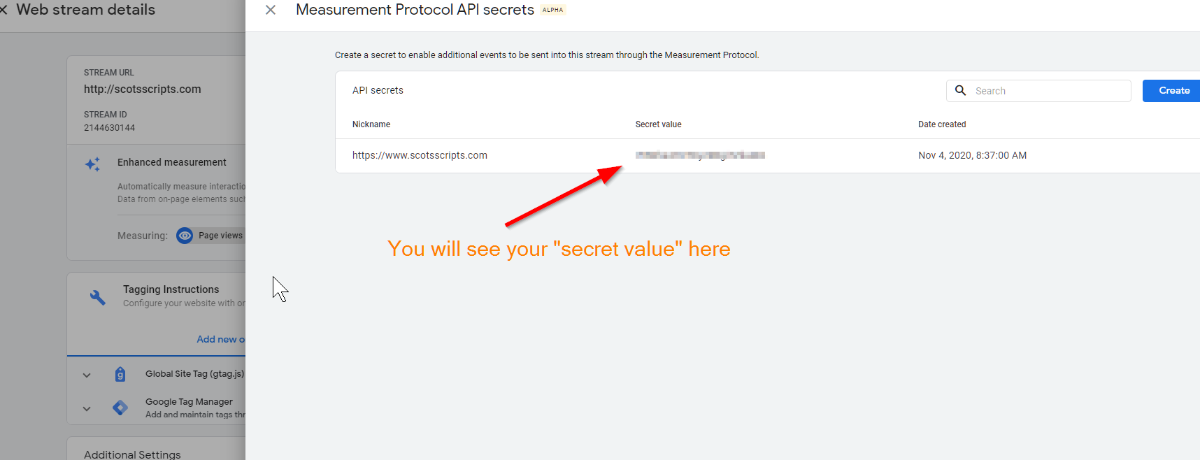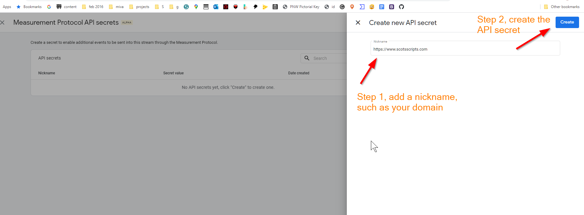 7. In the same MEASUREMENT PROTOCOL API SECRETS window click on the CREATE button to make an API SECRET. Give it a nickname, such as your domain name, and click the CREATE button.